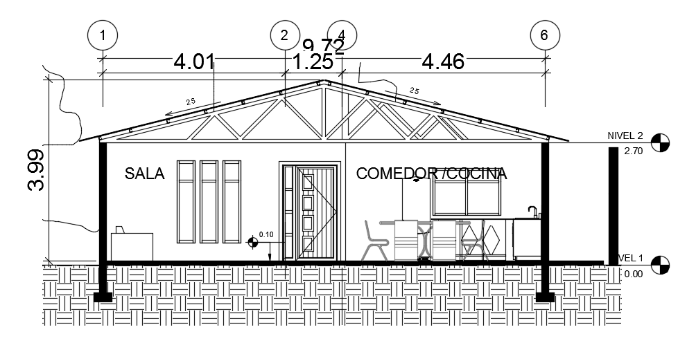 The front cut section view of the 15x10m villa building AutoCAD model is given in this file. The height of the building is 4.03m. The living room, kitchen, dining area, master bedroom, kid’s room, guest room, and service room with the attached toilet are available. For more details download the AutoCAD file from our cadbull website.