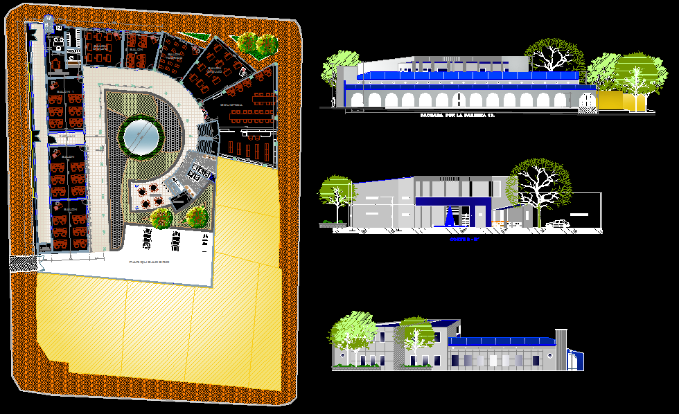 This School Project AutoCAD design provides a comprehensive 2D CAD layout that includes the master plan, detailed floor plan, and elevation drawings. The file showcases the complete structure of a school building with well-planned classrooms, administrative areas, corridors, and landscaped open spaces. The master layout clearly illustrates functional zoning, ensuring smooth movement for students and staff. The architectural design also features playgrounds, outdoor seating, and green surroundings, reflecting a student-friendly and sustainable environment.