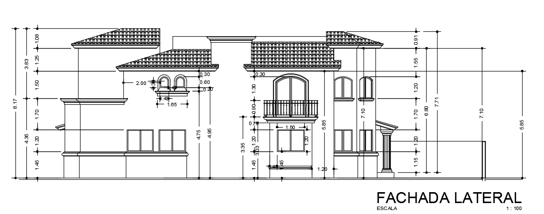 The left side elevation view of the 14x17m house building is given in this file. On this ground floor, the car parking, study room, vestibulo, bar, living room, kitchen, dining area, store room, and garden is available. On this first floor, the master bedroom with the attached toilet, guest bedroom with the attached toilet, kid’s bedroom with the attached toilet, and living room is available. For more details download the AutoCAD file from our cadbull website.