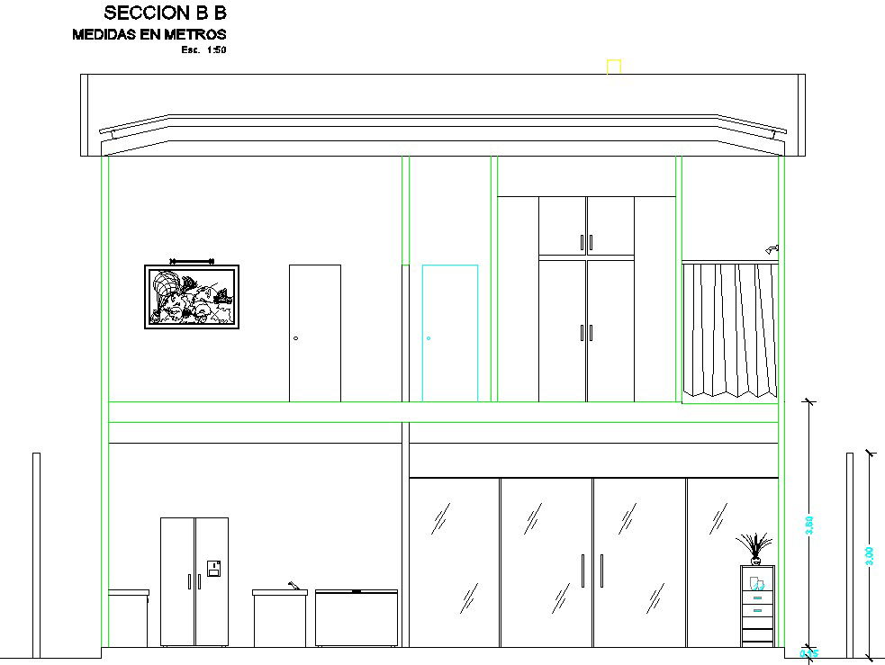 The front side section view of the 8x22m house building is given in this file. The car parking, living room, kitchen, dining area, master bedroom with the attached toilet, computer area, and gym is available on this ground floor. On this first floor, the master bedroom with the attached toilet, two guest room with the attached toilet, two kid’s room with the attached toilet, and living rooms are available. For more details download the AutoCAD drawing file from our website.