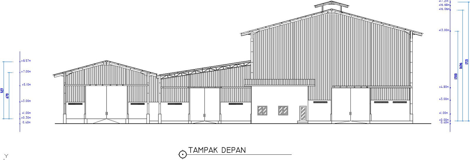 The front elevation view of the 18x12m ware house building CAD drawing is given in this file. This is single story warehouse building. The height of the warehouse is 8.27m. For more details download the AutoCAD drawing file from our website.