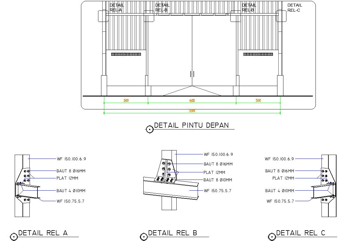 18x12m ware house building door detail drawing is given in this file. Bolt numbers and dimensions are given. For more details download the AutoCAD drawing file from our website.