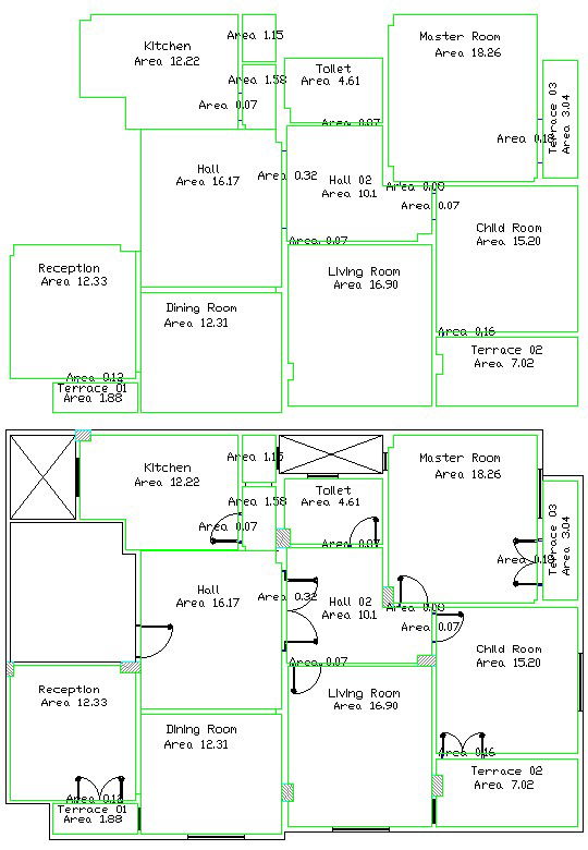 The door location of the 15x11m house plan AutoCAD drawing is given in this file. The living room, kitchen, child room, dining area, master bedroom, reception, and common toilets are available. For more details download the AutoCAD drawing file from our website.