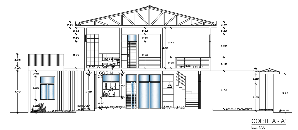 The left side section view of the 8x20m architecture 4bhk house building CAD model