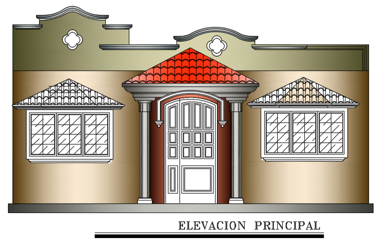 The main elevation view of the 8x13m 3bhk house building drawing is given in this file. This is a single story house building. The living room, kitchen, dining area, master bedroom with the attached toilet, guest room with the attached toilet, and kid’s room with the attached toilet is available. For more details download the AutoCAD file from our cadbull website.