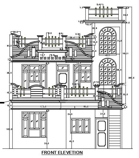 The front elevation view house building with dimension AutoCAD drawing is given in this file. This is G+ 1 house building. The ground floor, and first floor plan is given in this model. On this ground floor, the porch, living room, kitchen, pooja room, dining area, master bedroom, guest room, and common bathrooms are available. On this first floor, the lobby, kitchen, master bedroom, guest room, kid’s room, and common bathrooms are available. For more details download the AutoCAD file from our cadbull website.