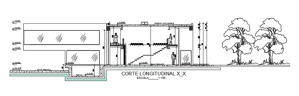 The left side cut section view of the 14x40m luxury bungalow house building is given in this file. This is G+ 1 house building. On this ground floor, kitchen, dining area, bar, maid room with the attached bathroom, swimming pool, gent’s bathroom, ladies bathroom, family area, master bedroom with the attached toilet, car parking, lavanderia, and other details are mentioned. On this first floor, the TV room, family room, music room, study room, living room, two guest room with the attached bathroom, three kid’s room with the attached bathroom, and master bedroom with the attached bathrooms are available. For more details download the AutoCAD drawing file from our cadbull website.