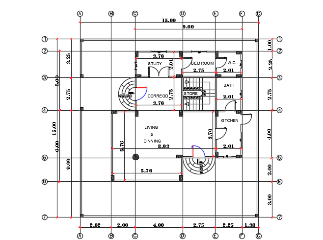 15x15m two story ground floor house plan AutoCAD model is given in this file. The living room, dining area, kitchen, store room, corridor, study room, master bedroom with the attached toilet, and common bathrooms are available. For more details download the AutoCAD drawing file from our cadbull website.