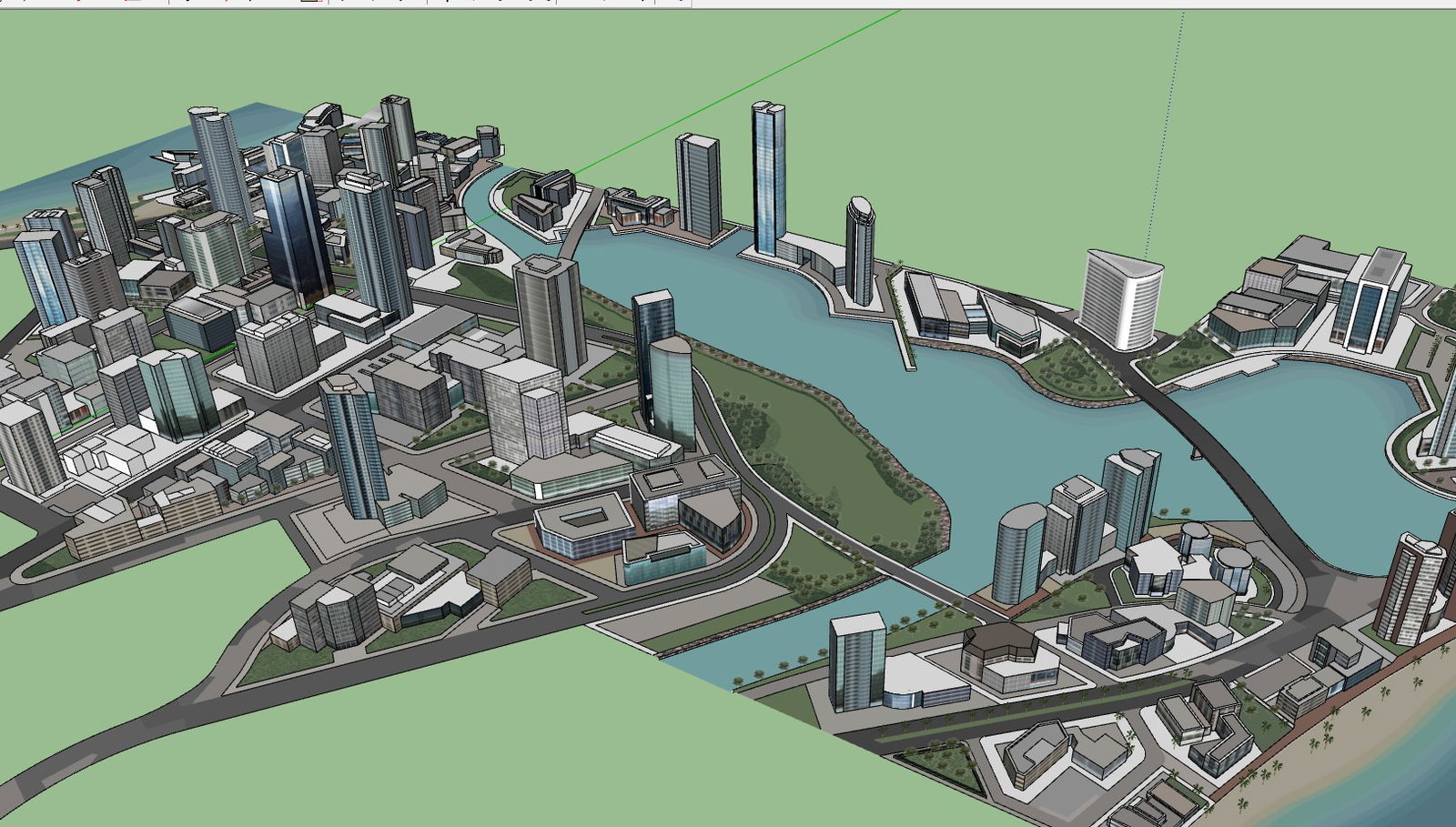 3D township with high rise buildings, bungalows, water tanks, clubs, school, garden, government and private offices and metaled roads