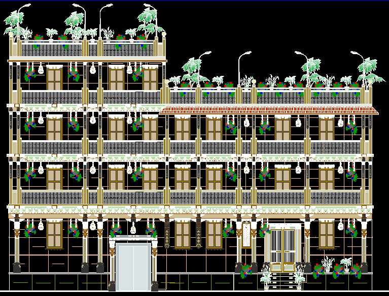 This Hotel Project AutoCAD design showcases a beautifully rendered 2D architectural elevation with intricate detailing and realistic exterior elements. The CAD drawing presents a complete front view of a multi-story hotel structure, featuring balconies, lighting fixtures, and decorative railing work. The elevation includes architectural ornaments, rooftop landscaping, and façade details that highlight a perfect balance of style and functionality. Designed for architects, designers, and civil engineers, this drawing serves as a professional reference for creating commercial hospitality projects.