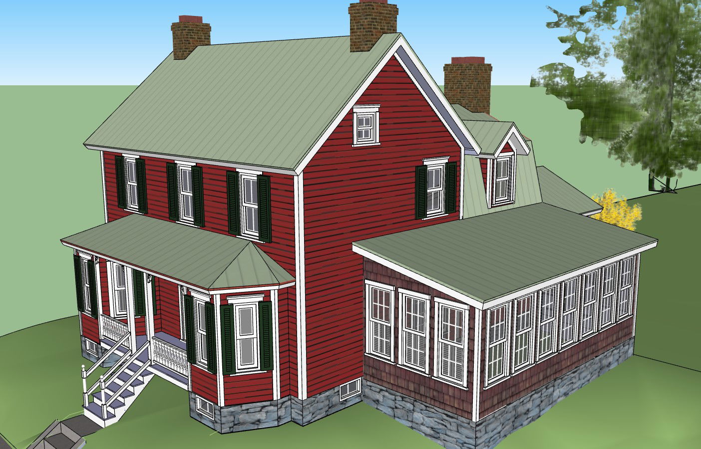 3D Old House with chimneys, bedrooms, living room and study room.