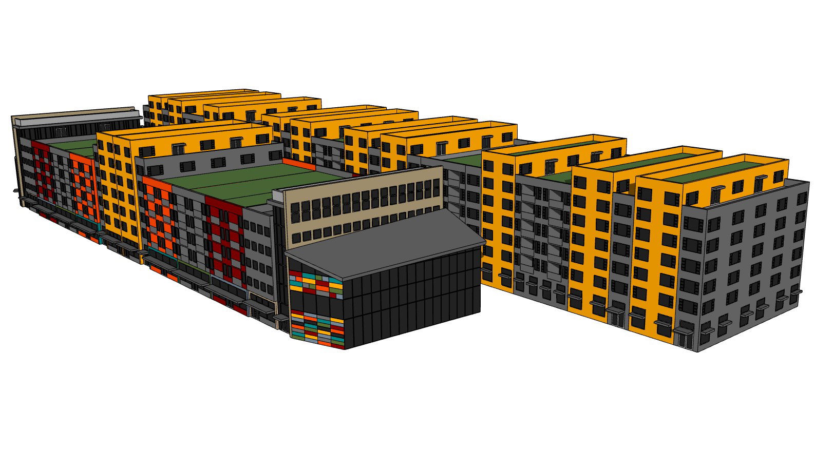 3D colourful Urban Society with high rise buildings and 2,3 4 and 5 bhk flats and separate bungalows. School, shops and play area.