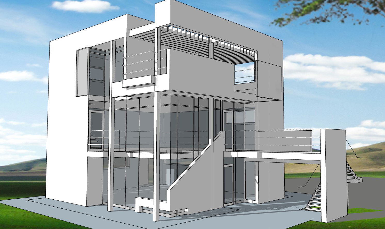 3D Contemporary Glass House with balcony and open terrace, bedroom, drawing room, dining room kitchen and staircase