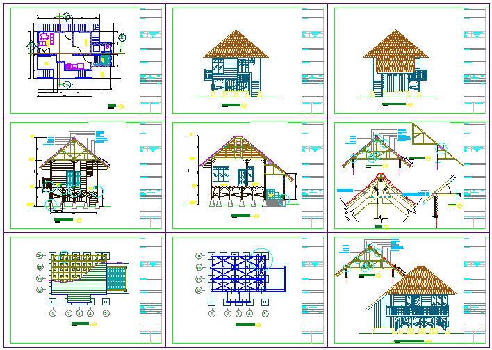 Layout plan with detailing of construction, roof detail, structure detail, joining filter detail, also have election plan and elevation design of wooden house project.