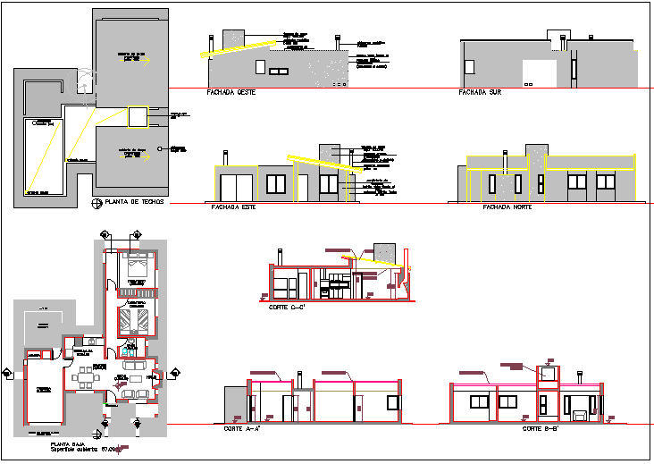 Cottage dwg file. the architecture layout plan of ground floor have detailing of 1 master bed room, two single bed room, kitchen, drawing room, dining area with section plan and elevation design of cottage project.
