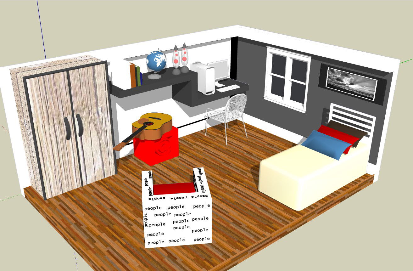 3D Interiors of a Modern Bedroom with bed, sofa, cupboard, guitar, chair and a computer