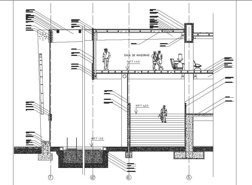 sectional drawing of laminated wood design with levels, material classification and foundation details in autocad file