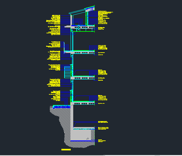 sectional elevation of building facade with labels, levels, material, dimensions and every small details of construction with structural details from foundation to roof