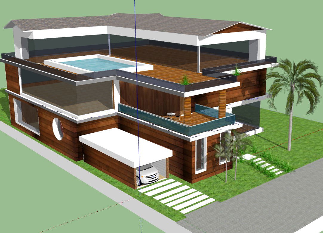 3D Modern Villa with Roof Top swim pool car parking space, chimneys, bedroom, drawing room, dining room, kitchen, bathroom and balcony