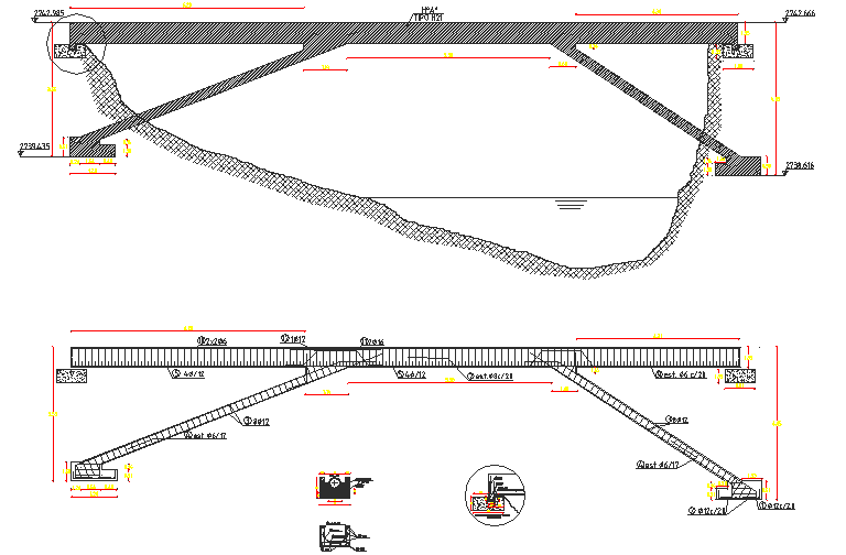 Sectional drawing of aqueduct bridge in concrete with joinery details, structural details,reinforcement details including number of steel bars and their dimension and distance, foundation details and hieght of the bridge in autocad.