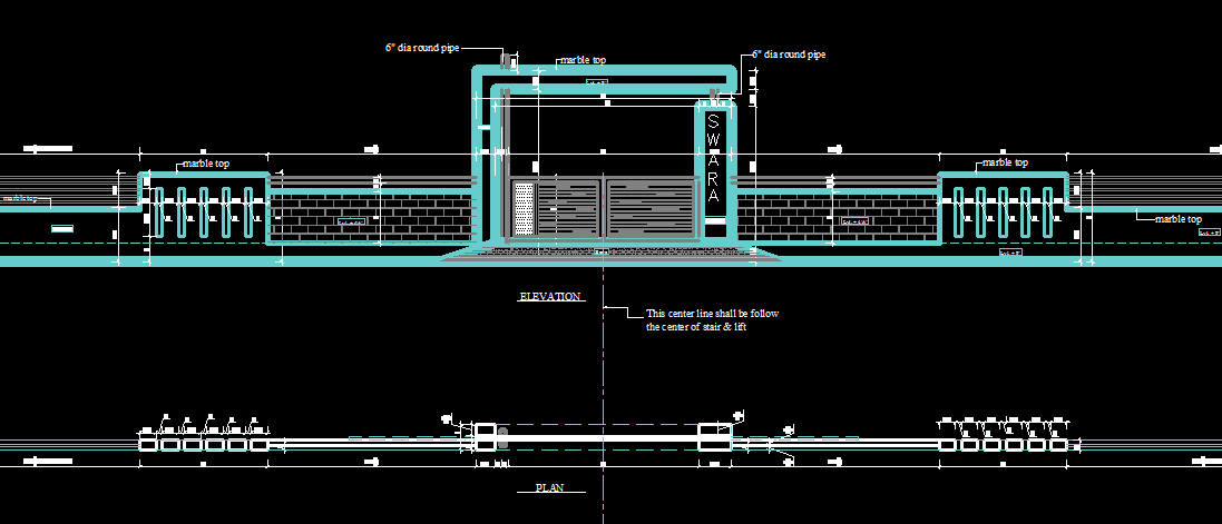 In this AutoCAD DWG file, the front elevation illustrates marble tops, pipe dimensions, and brick masonry alignment, ensuring both durability and aesthetics. The layout also includes precise centerline markings, making it suitable for real-world construction applications. The combination of plan and elevation views ensures a clear understanding of proportions, materials, and scale. Whether you’re working on a residential gate design or a compound wall project, this CAD file offers practical and aesthetic value.