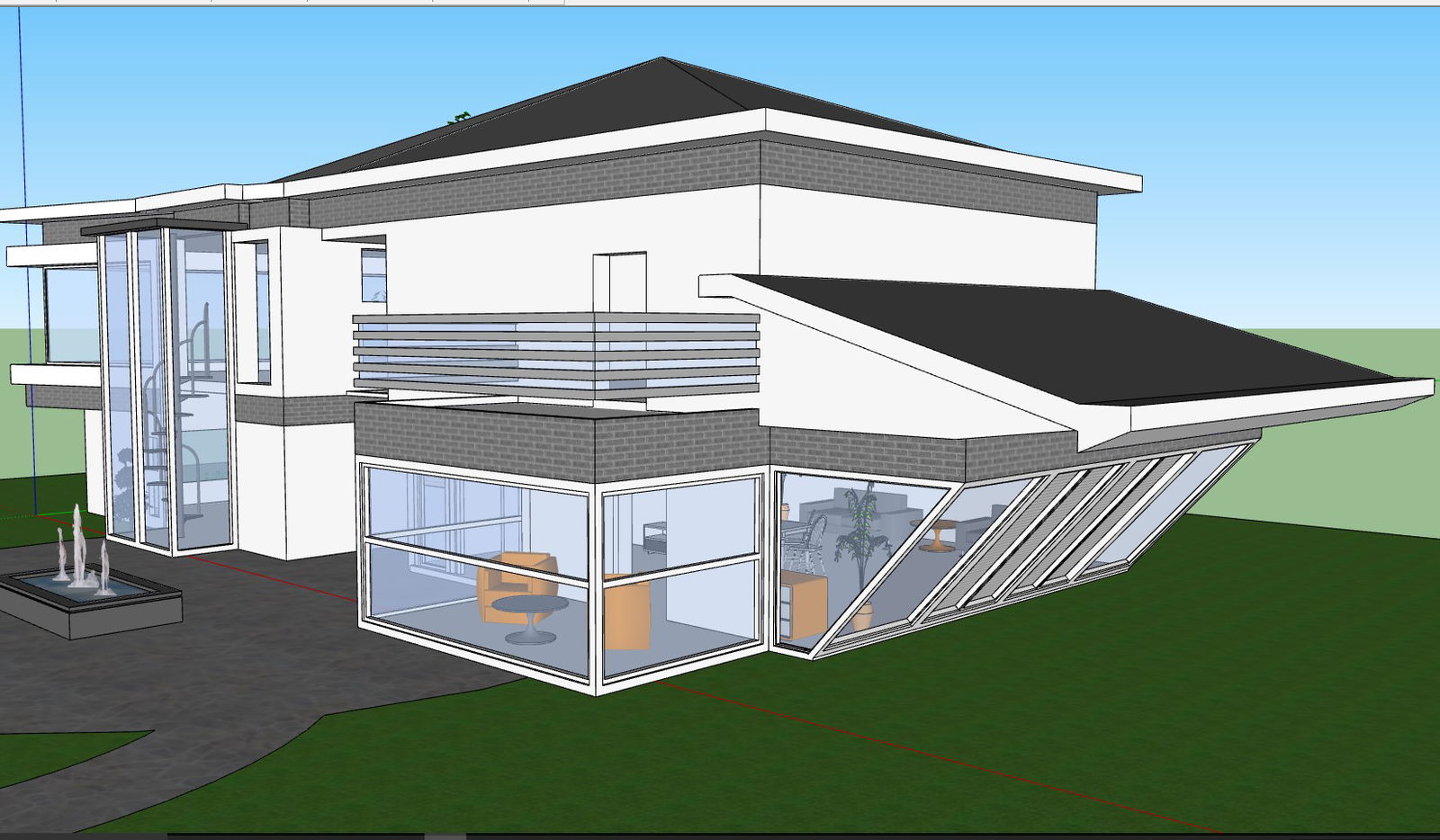 3D Glassed Modern House with bedroom, study room, spiral staircase, modular kitchen, fountain, balcony and combined drawing and dining room.