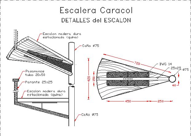 Detail of spiral stairway with designed plan, section and view of it in detail description of material, dimension and part specification in autocad drawing.