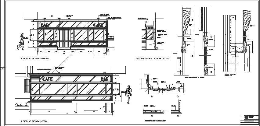 Here the detailed facade drawing of a coffee bar with two side facade showing human scale, all details, specification and dimension of elements with zoomed sectional elevation of small part of the facade with different detailed drawing of joinery and facade in autocad drawing.