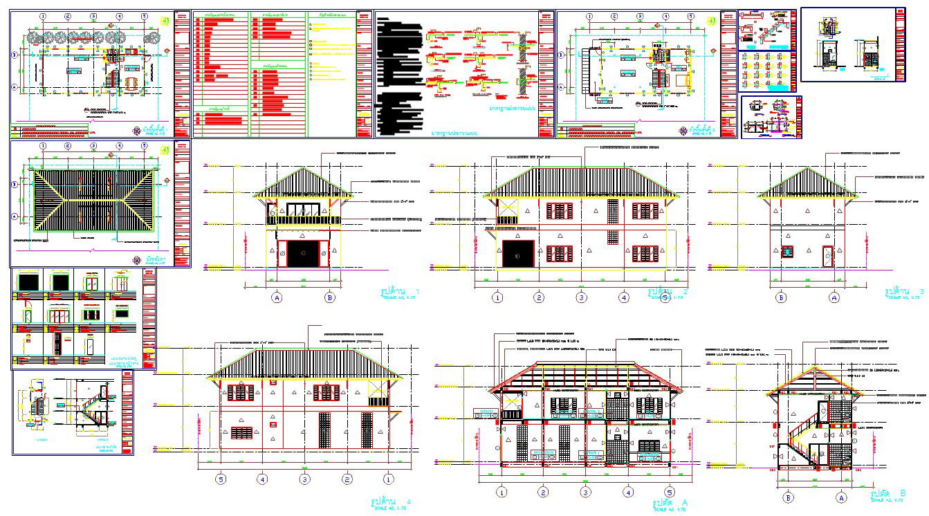 Autocad file of plan and furniture layout plan, detailed sectional elevations of bungalow house.