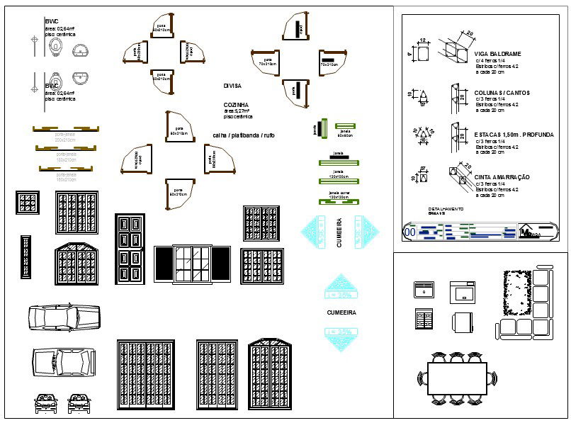 Here is the description of plan of a door , elevations of the door , plan of the bathroom accecories like WC, Wash basin, Shower. Plans of furniture like dining table, sofa set, wash basin.