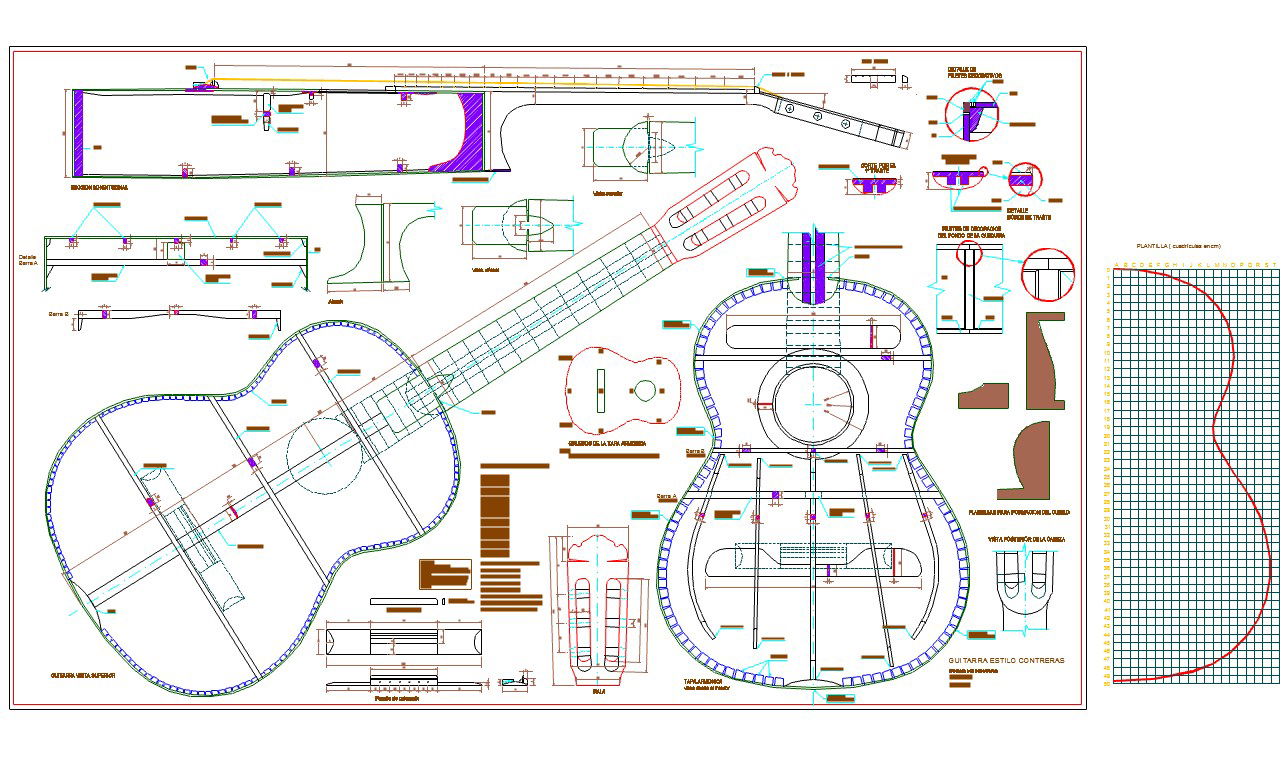 Here is the autocad dwg ofdetail plan of guitar and its detailed elevations.