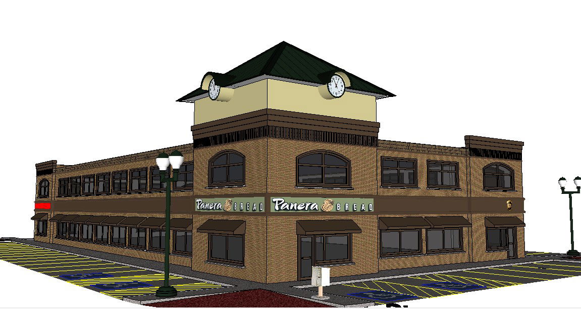 3D Corner Restaurant and Bakery with dining room, washroom, kitchen, store room and clock.