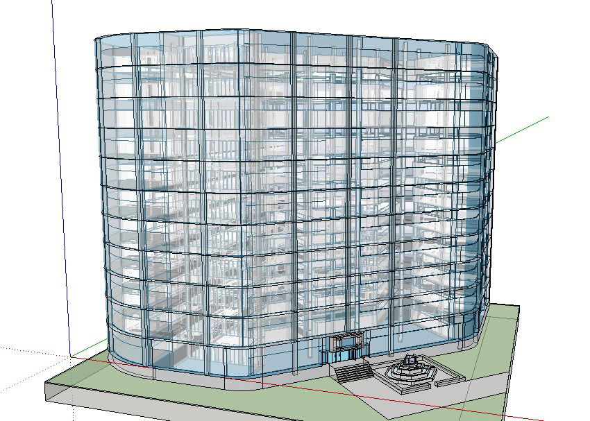 3D Glassed IT Hub with elevators, reception, cafeteria, garden, free smoking zone, offices, washroom, emergency exit, staircase and car parking zone.