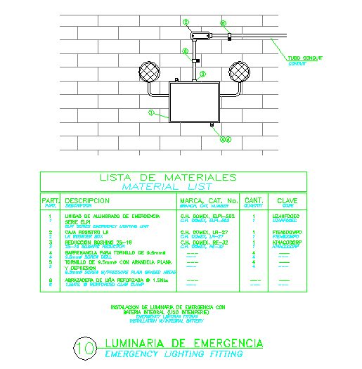 here is the description for an Emergency lighting fitting with its plan and a material list .