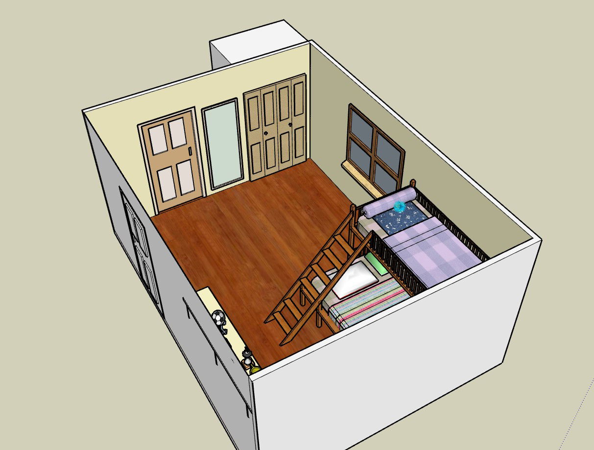 Interiors of a Children's' Bedroom with bunker bed, study table and cupboard.