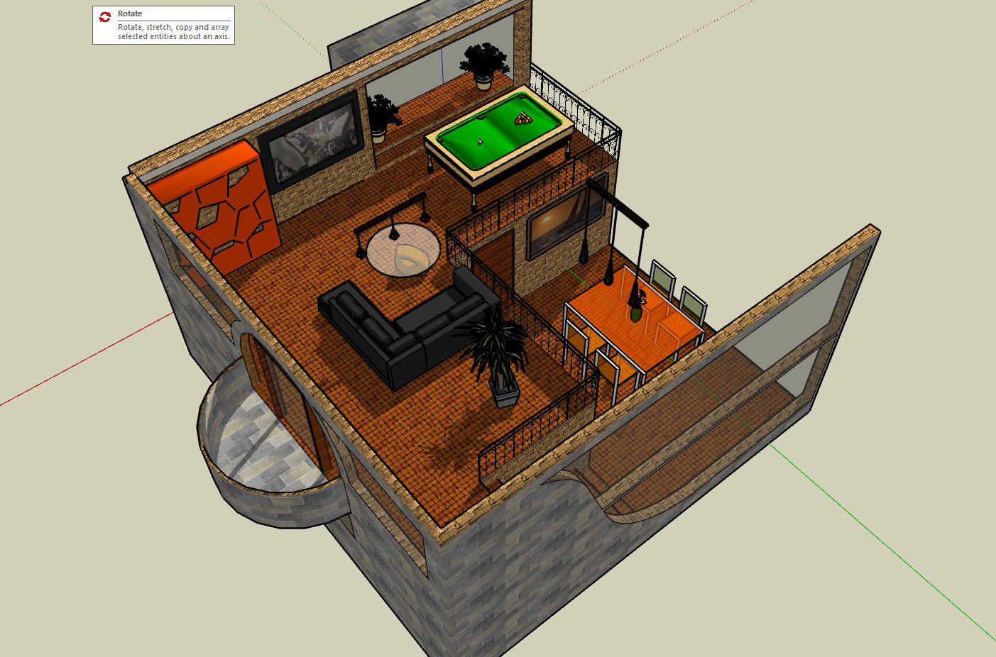 3D Rest House with bedroom, drawing room, living room, bathroom, washroom, dining room, kitchen, pool table and balcony.