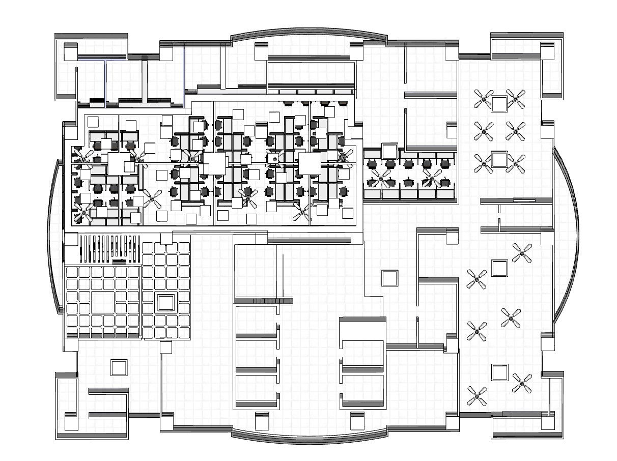 3D Interiors of a MNC Office with air conditioned cabins, elevators and basement parking, garden, cafeteria, washroom, reception, security room and separate smoking zone.