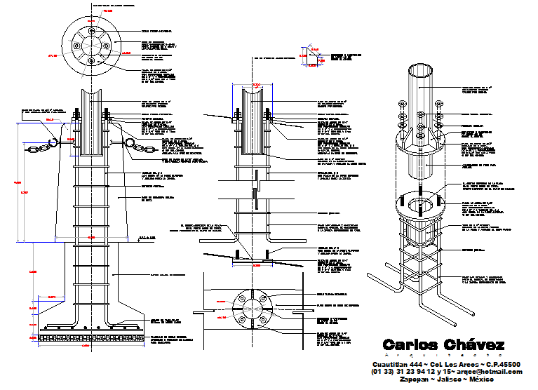 Here is the detailed autocad dwg of detail of base of collapsible column wit hits detail elevations and its 3Dview in autocad.