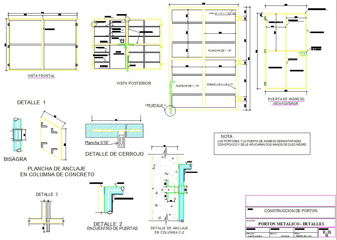 Here is the detailed autocad dwg of detail of metallic gate with its detail plan and elevation of gate with its sectional elevation and its 3D view.