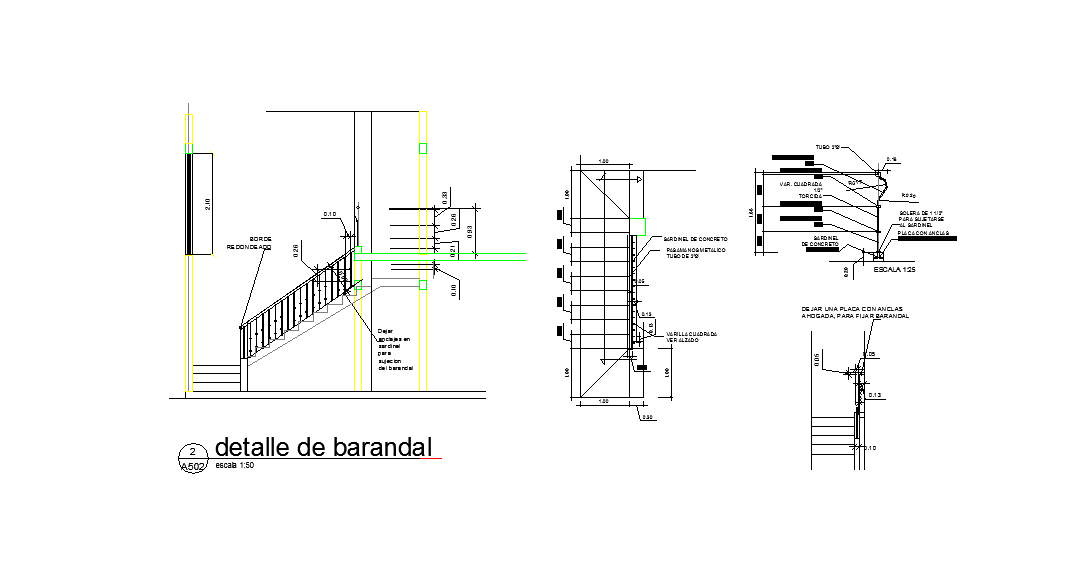This is an Autocad Dwg file for details of a Hand Railing, side elevation and front elevation details with the plan.