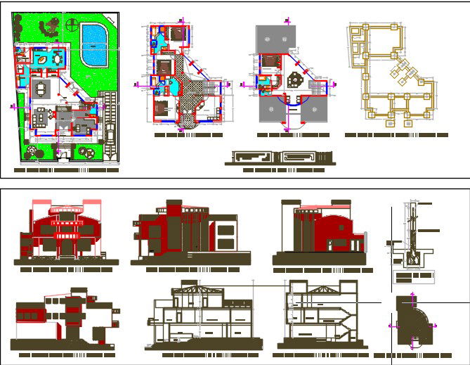 Here is the detailed autocad dwg of floored villa full project with its detail civil plan of the villa,its furniture layout ,presentation plan,rendered plan,sectional elevations.