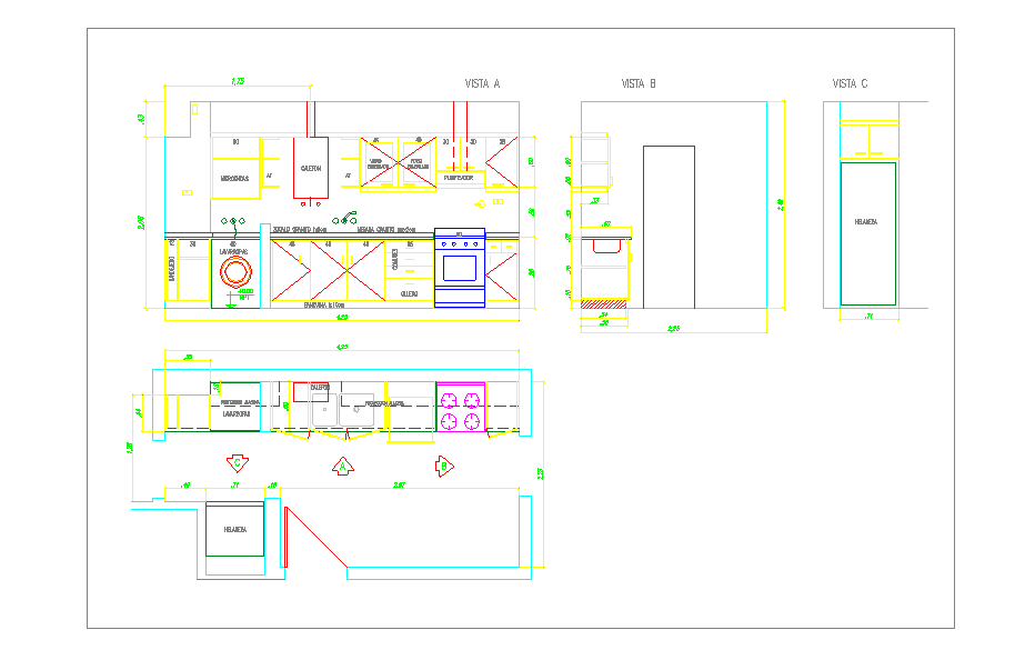 This is an Autocad Dwg file for details of Kitchen Furniture with front elevation, side elevation and detailed plan.