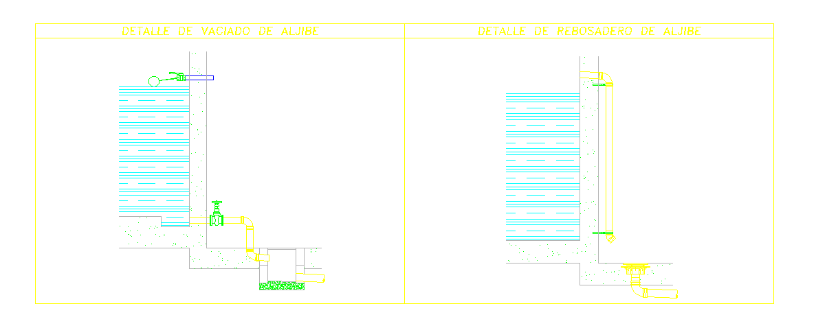 This is an Autocad Dwg file for details of drain and overflow of Cistern with front and side elevation.A tank for storing water, especially one supplying taps or as part of a flushing toilet.