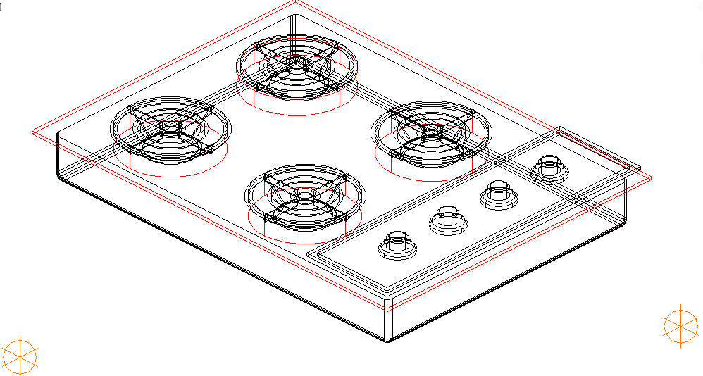 Here is the detailed autocad dwg of gas stove with its detail 3d view of the gas stove of four burners.