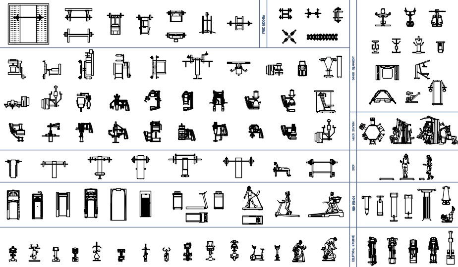 Here is the autocad dwg of gym equipments block,plan of the different equipments of the gym,elevation of the gym machines.