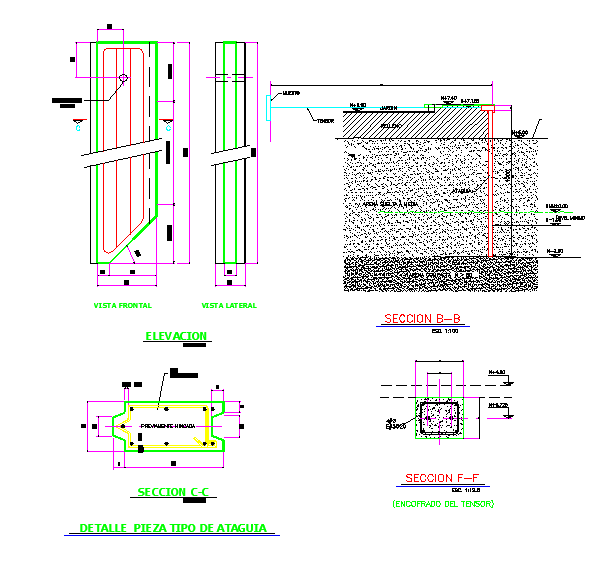 Here in this autocad file there is a detail contention for beach wall with its front elevation, side elevation and detailed plan.