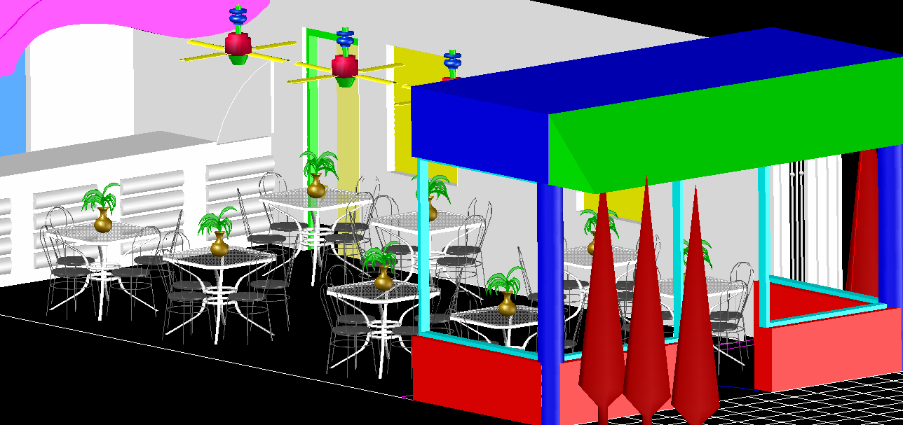 This 3D Restaurant CAD Drawing showcases a complete interior setup featuring a vibrant seating arrangement, decorative plants, wall partitions, and ceiling fans, all displayed in a detailed rendered view. The DWG file includes precisely modeled dining tables, chairs, and décor elements that highlight the spatial organization of a modern restaurant environment. The drawing helps interior designers and architects visualize space planning with accurate dimensions, ensuring comfort and aesthetic appeal. The use of bold colors and realistic components makes this 3D layout perfect for concept visualization and presentation in client proposals.