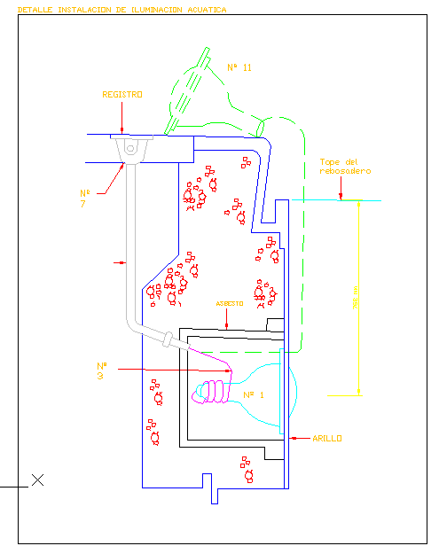 This autocad file consists of details of an installation of aquatic ilumination along with its detailed side elevation.
