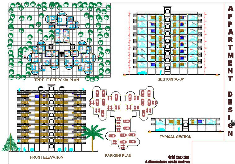 Here is the autocad dwg of apartment design with its detailed plan,detailed sectional plan of the apartment,parking plan,tripple bedroom plan,typical section of the apartment and front elevation of the apartment building.