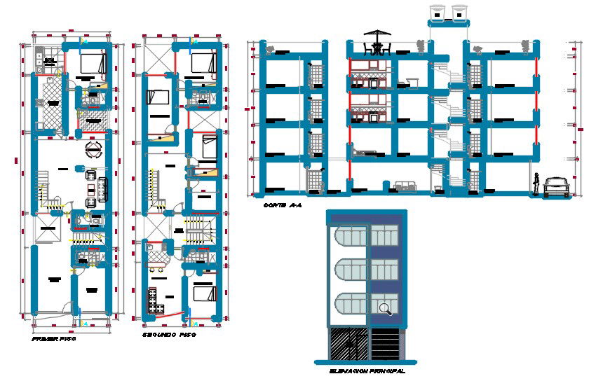 Here is the autocad dwg of multi family building,civil plan of the apartment building with its detail sectional elevation of the building ,front facade elevation of the building.